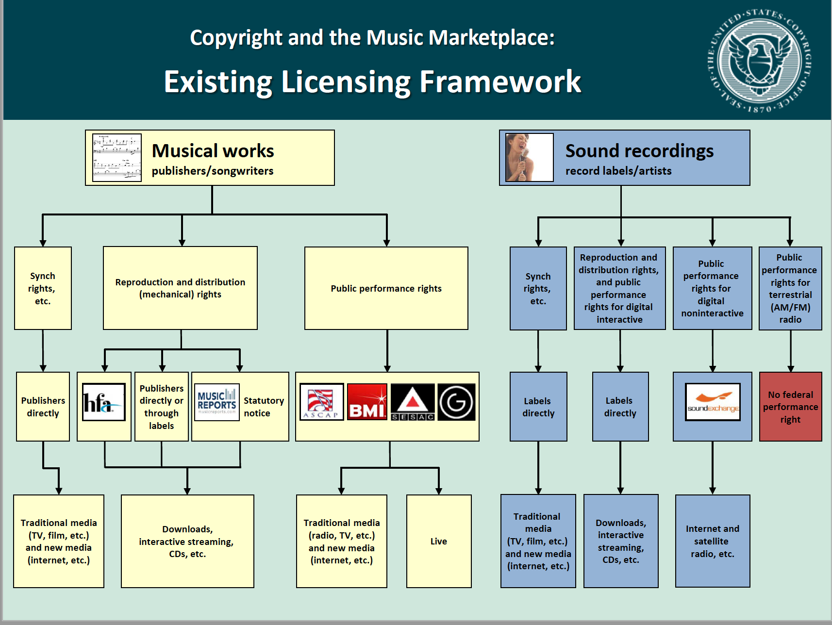 If you’re wondering about the public performance rights of owners of sound recordings – they don’t have one, except for digital audio transmissions. 17 U.S. Code § 106