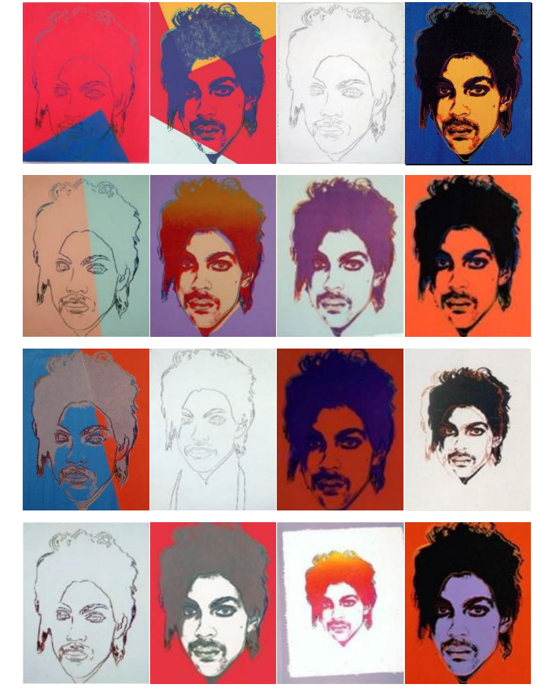 The photo of Prince directly below was taken by Lynn Goldsmith in 1981. Andy Warhol used this photo to create an unauthorized series of sixteen silkscreens and drawings – the “Prince Series” – which appears below Goldsmith’s photo.